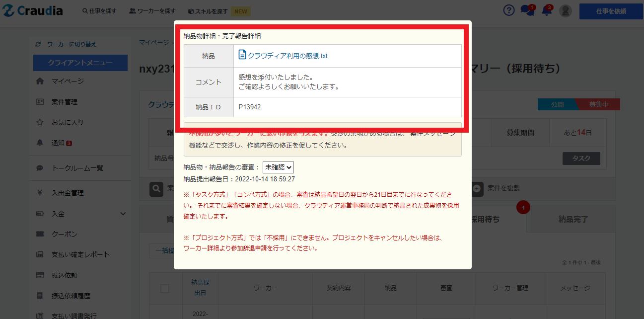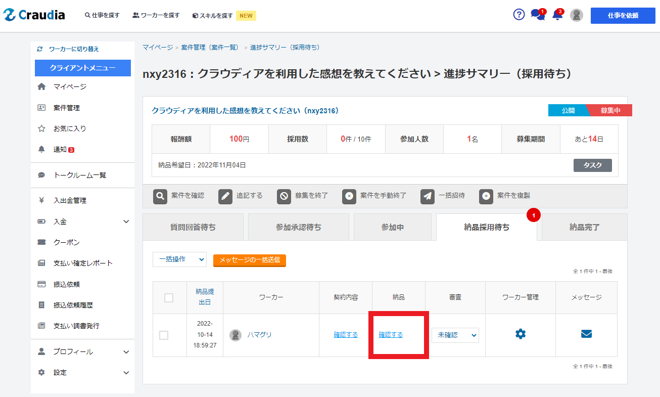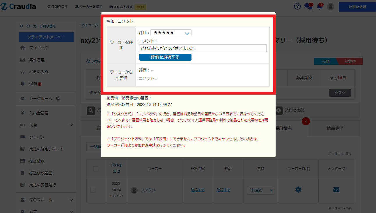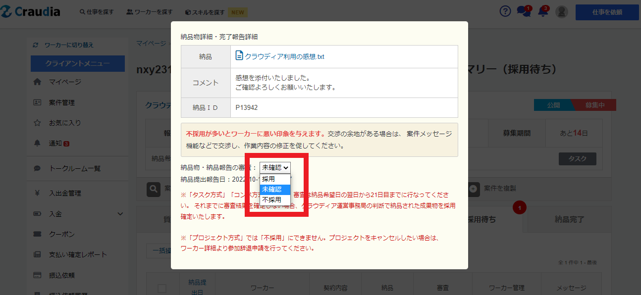納品された制作物に問題がなければ「納品物・納品報告の審査」のプルダウンから「採用」を選択してください。