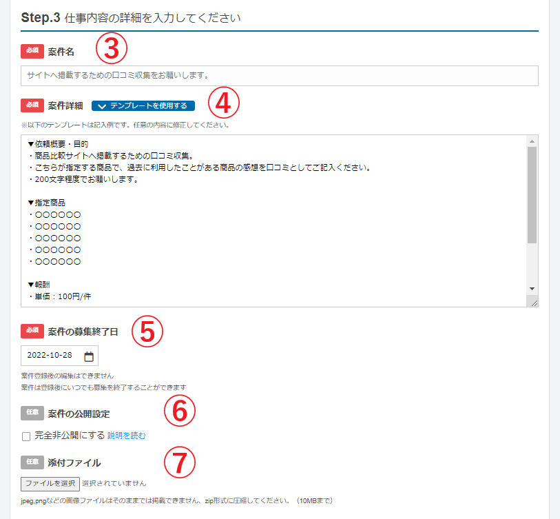 ⑦ 仕事内容の説明の補足としてファイルを添付することができます。
