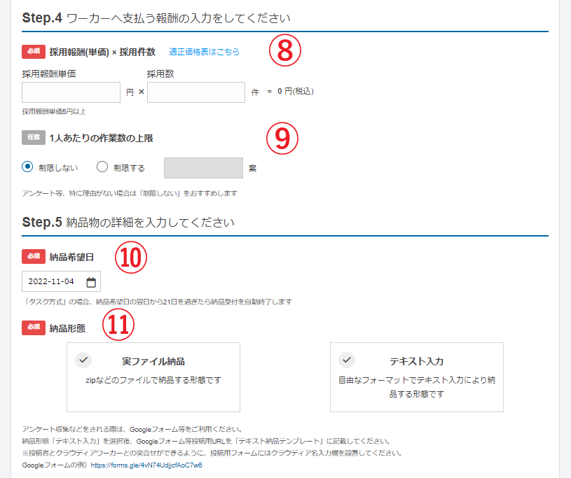 ⑧ 1件あたりの仕事の単価と採用数を設定してください。